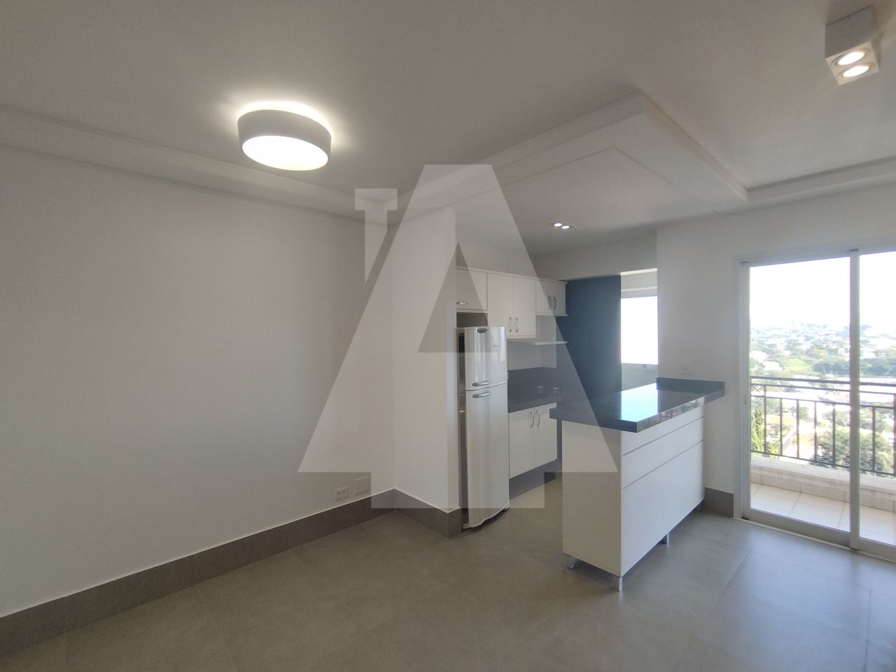 Sala com sacada e uma vista incrível.
