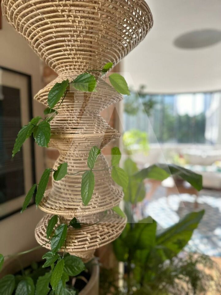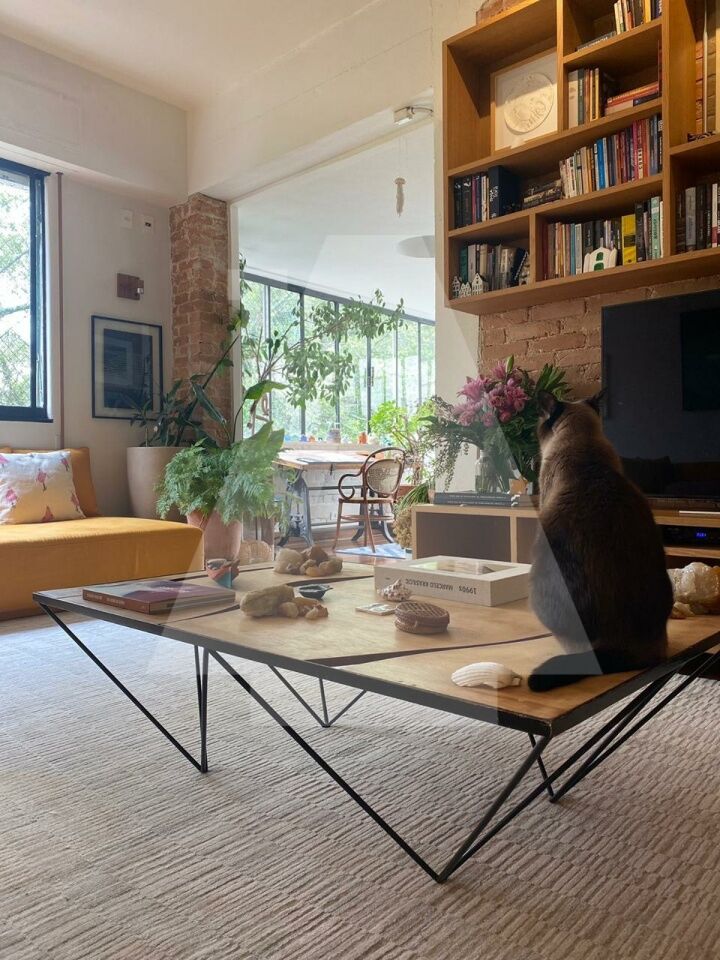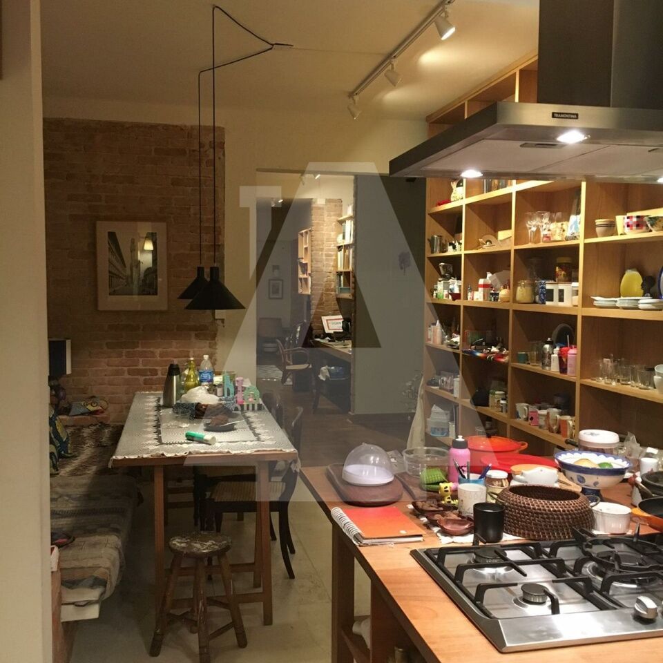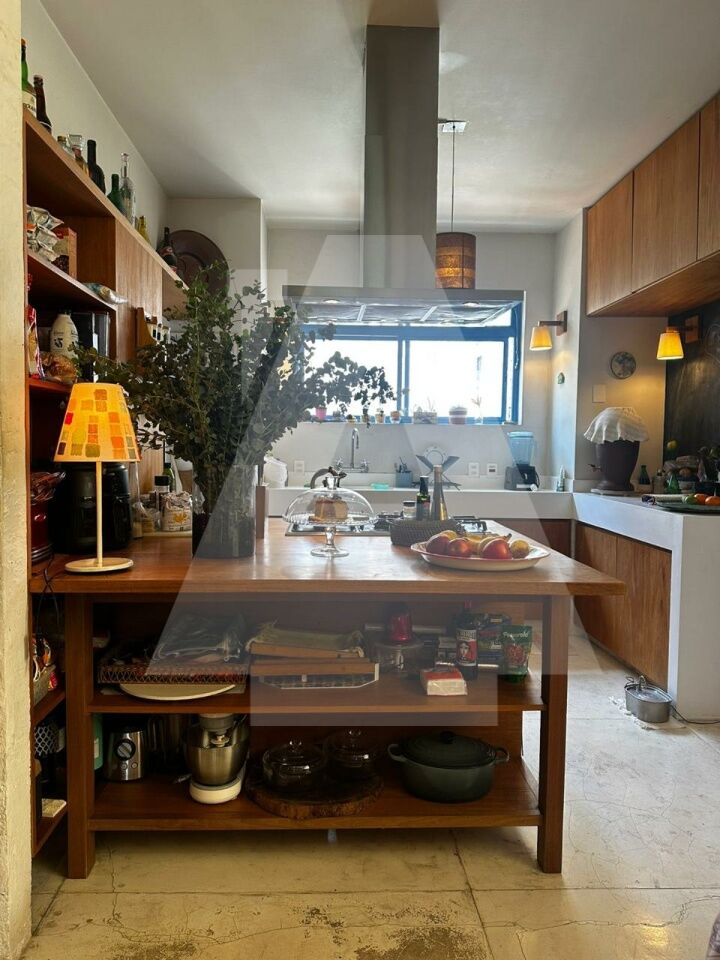 A cozinha é integrada ao living, mas mantém certa privacidade. É repleta de armários e conta com uma ilha de madeira maciça em jequitibá-rosa. Permanecem no imóvel o cooktop embutido de cinco bocas, a coifa moderna e a geladeira.
