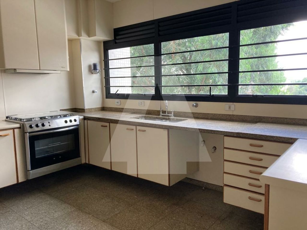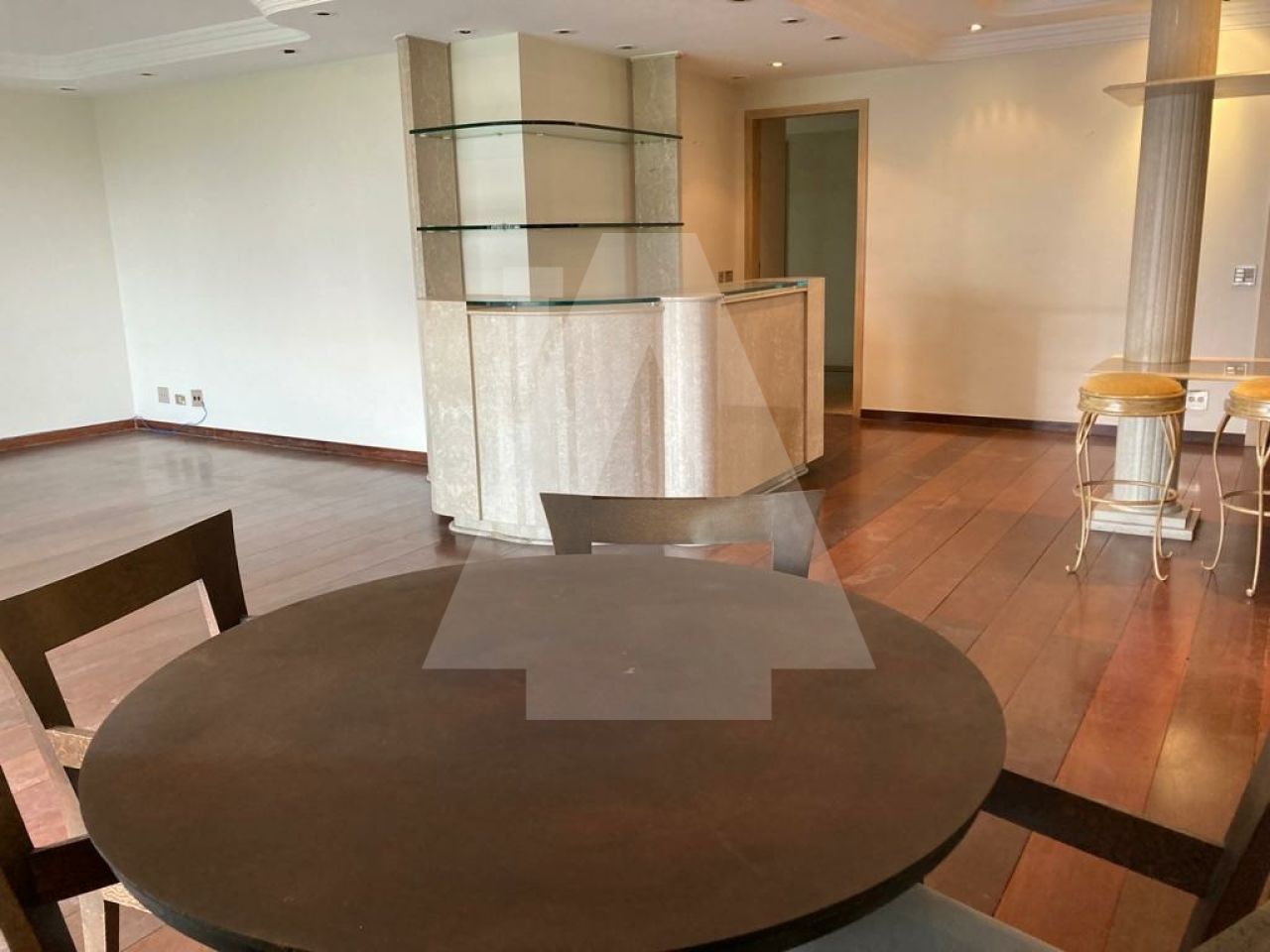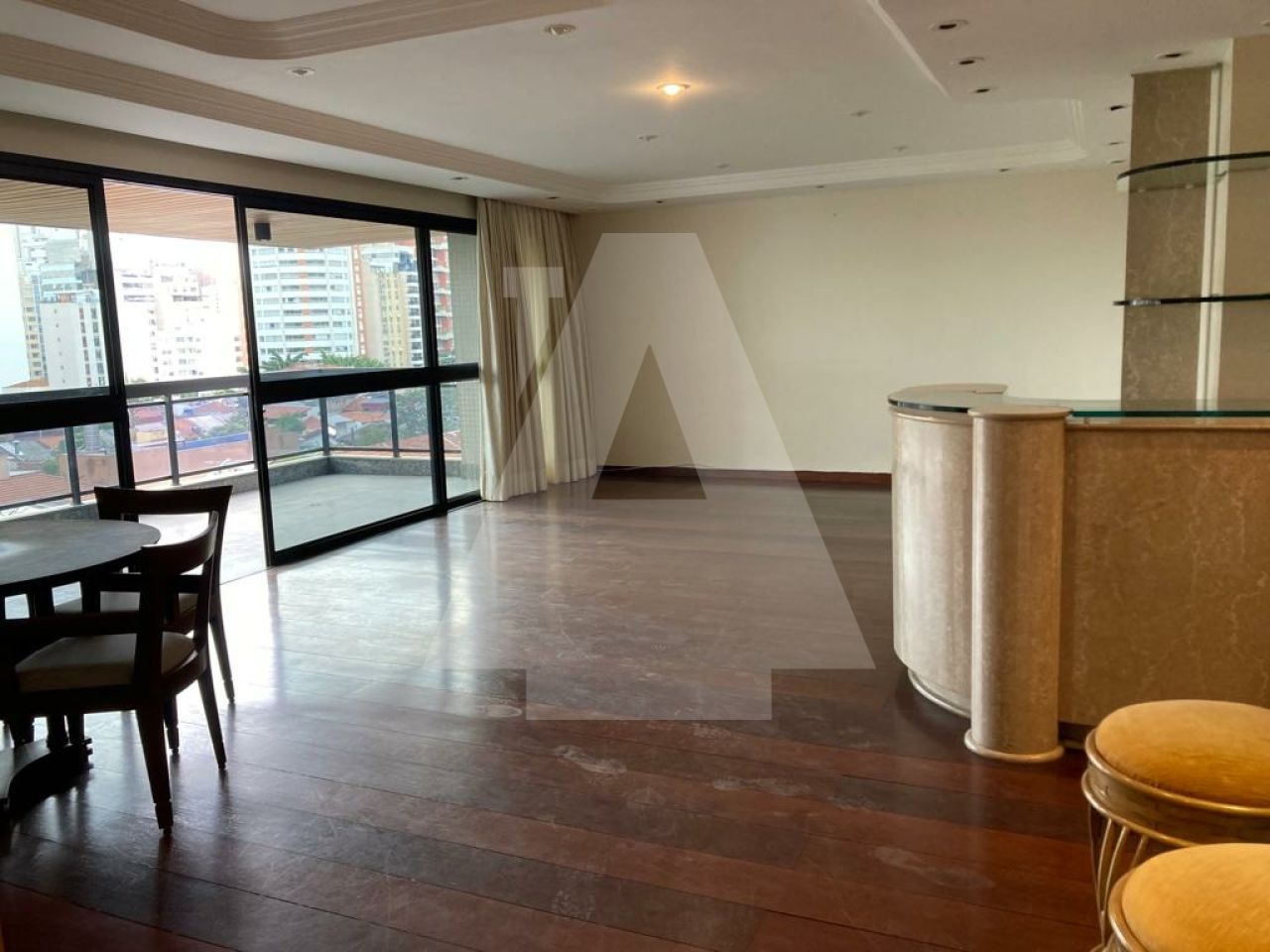Living para vários ambientes, sala de jantar muito espaçosa separada, amplíssima cozinha com copa, e dois quartos de serviço.