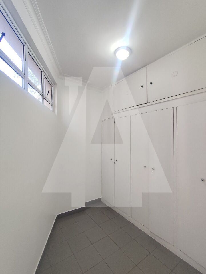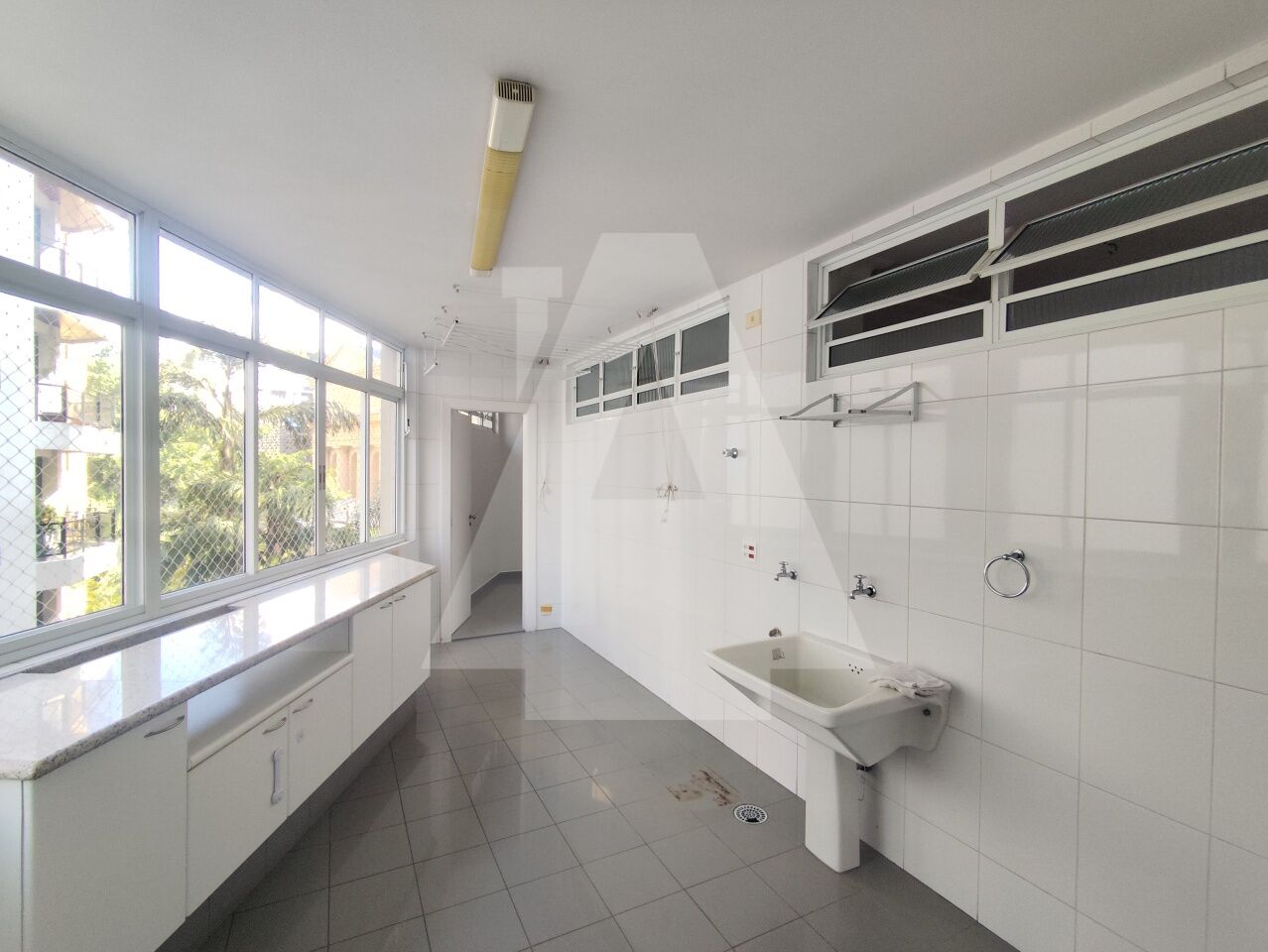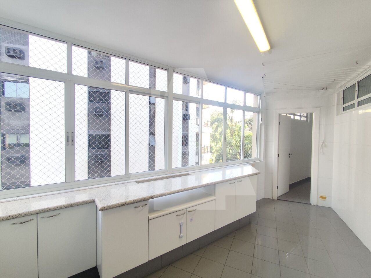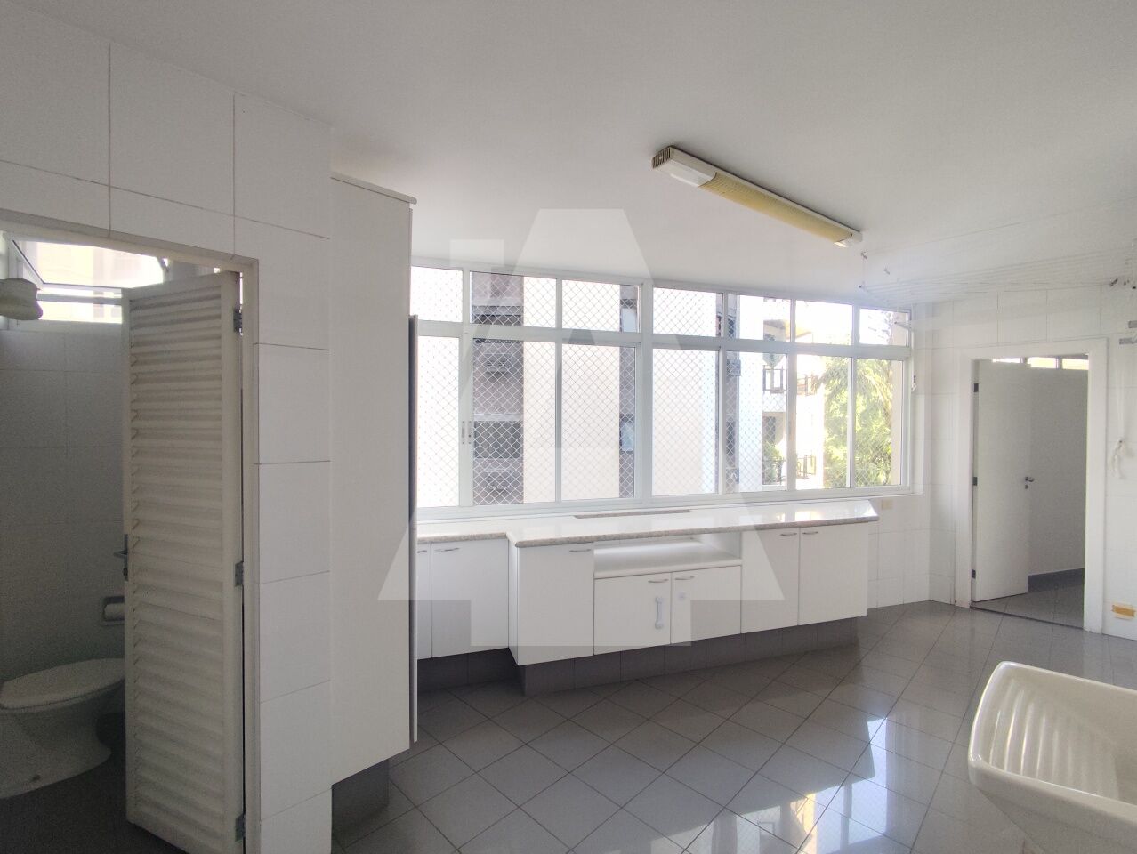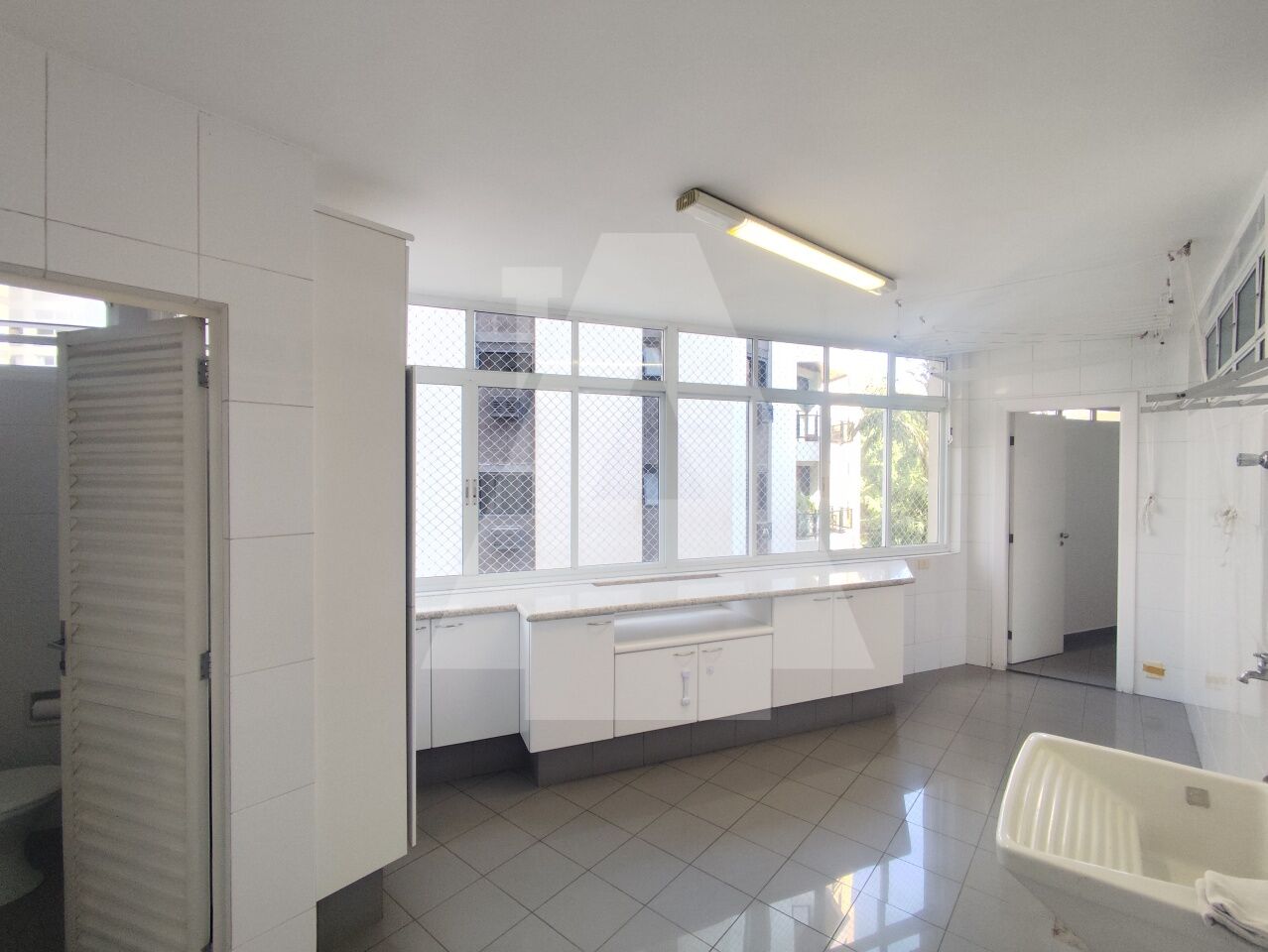 Cozinha com diversos armários e uma área de serviço excelente, com espaço para máquina de lavar, tanque, um dormitório e banheiro de serviço.