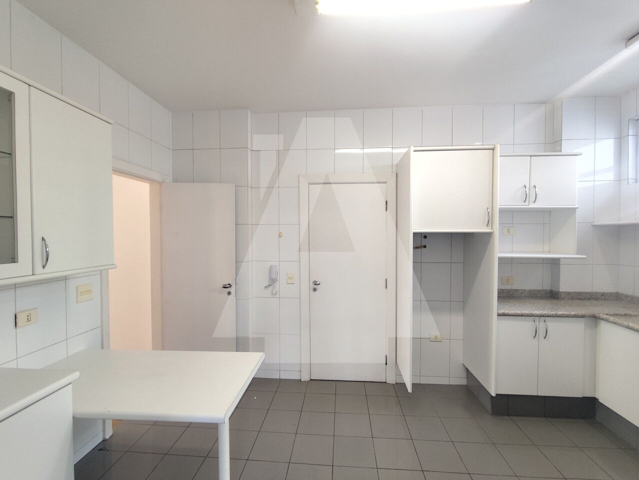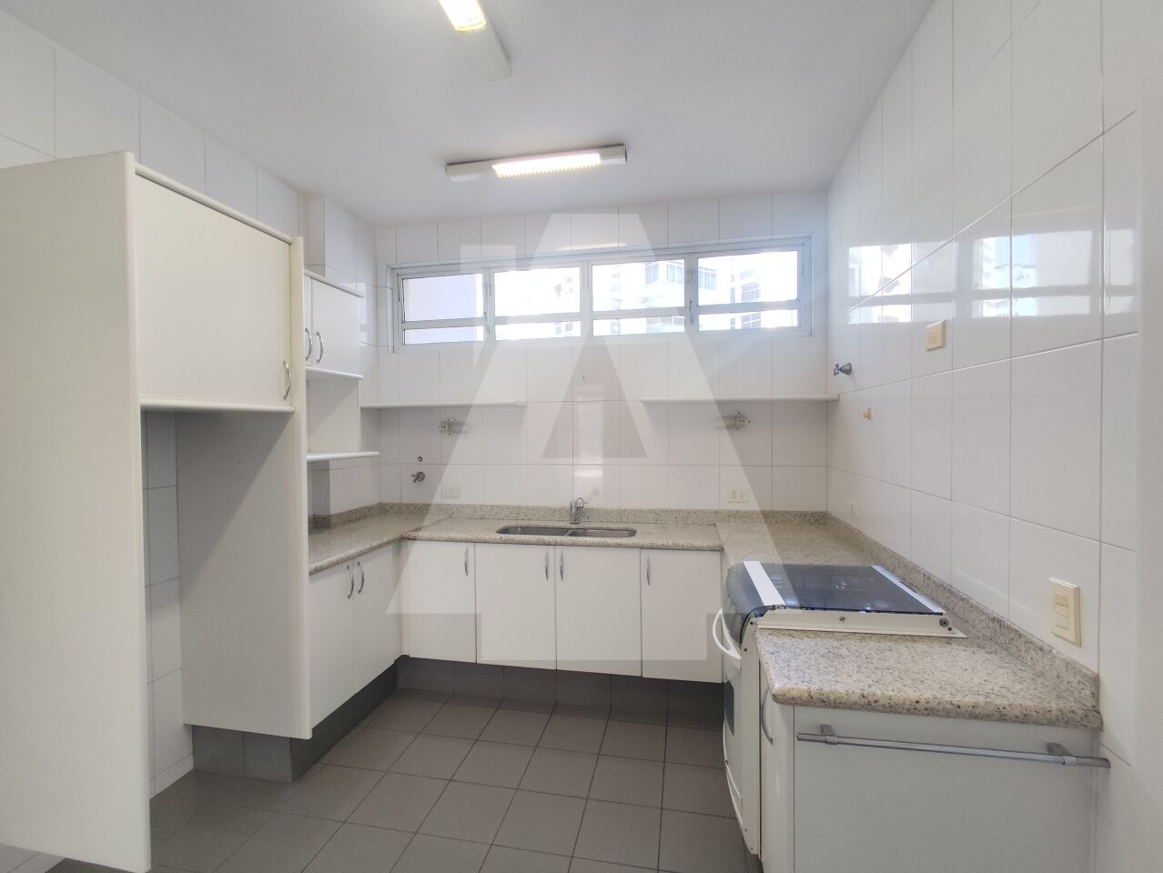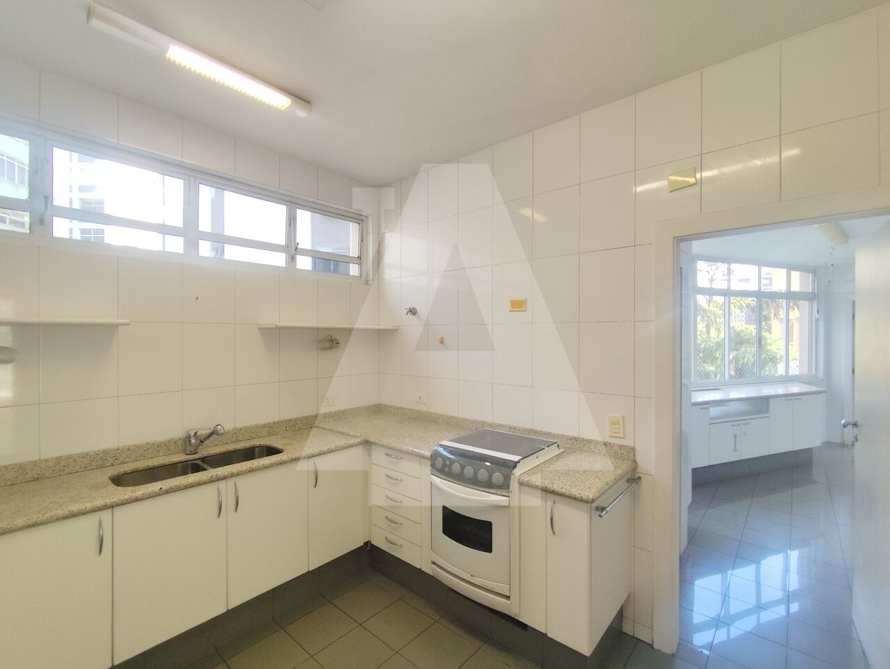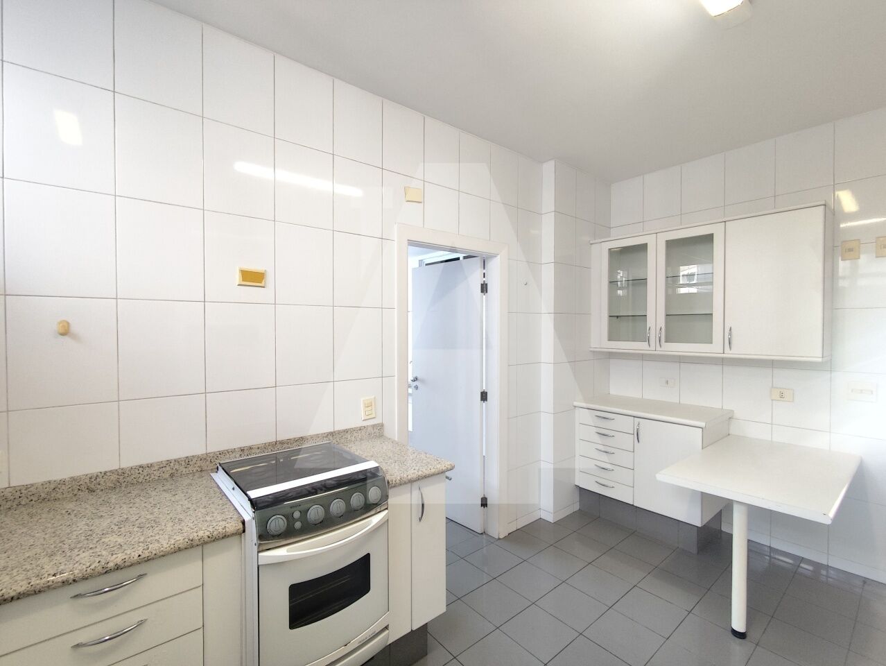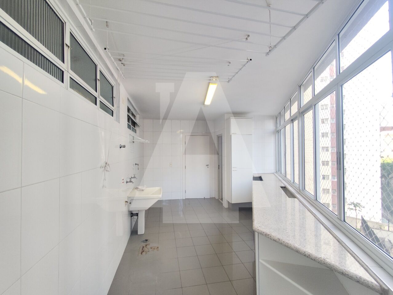 Cozinha com diversos armários e uma área de serviço excelente, com espaço para máquina de lavar, tanque, um dormitório e banheiro de serviço.