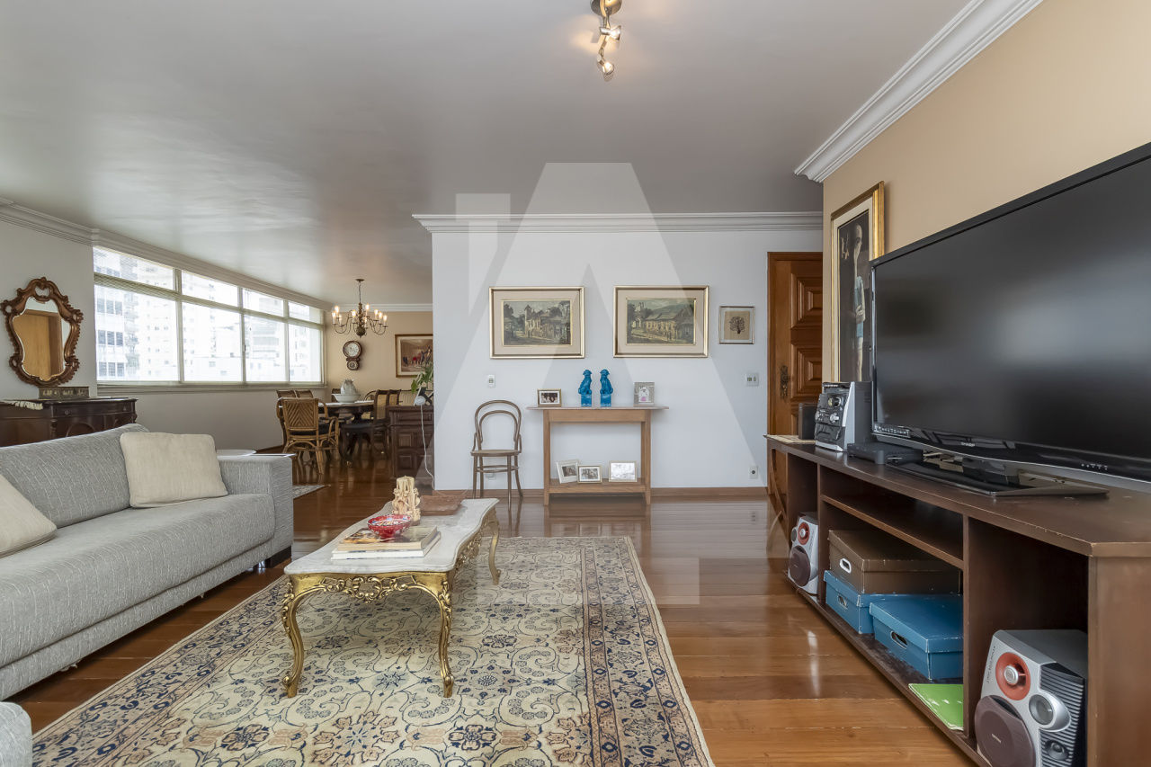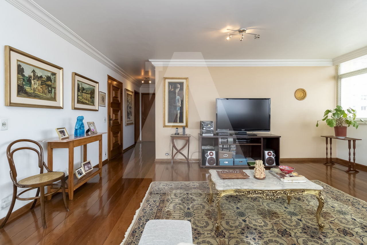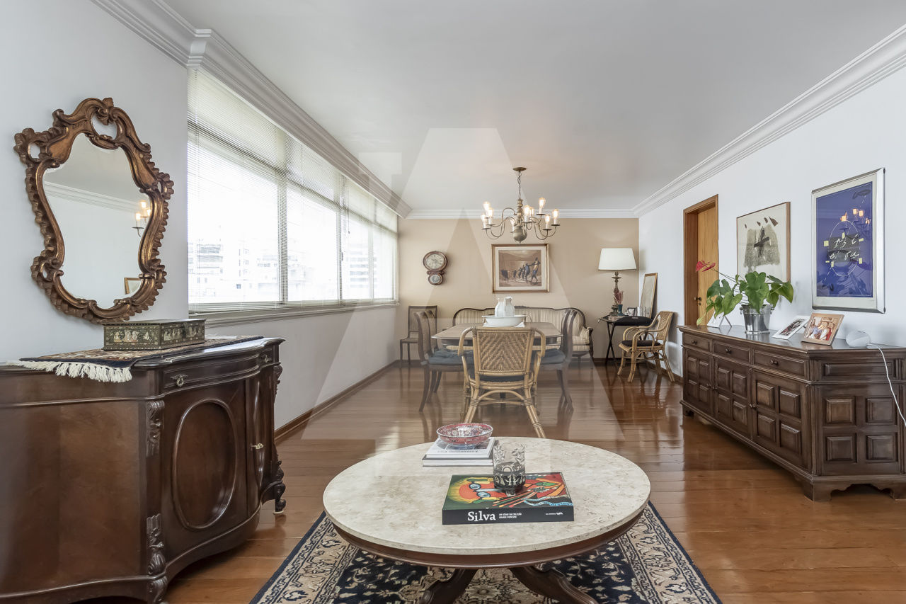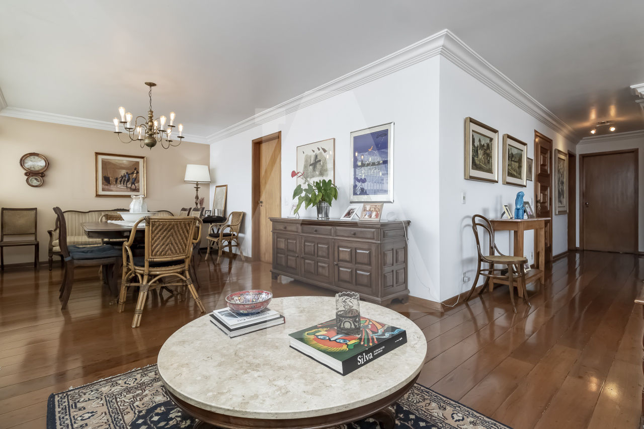 Apartamento bem conservado, para voce trazer seu arquiteto e deixar do seu jeito. Com 233m² de área útil e um potencial incrível. São 4 dormitórios sendo 1 suite, com closet, (possibilidade de fazer mais 2 suites) living para 3 ambientes e 2 vagas na garagem. Por conta das janelas laterais o apartamento tem muita luz natural e o andar alto proporciona uma linda vista. Piso de tábua corrida na sala e sinteco na área íntima. Lavabo e um banheiro social. Copa e cozinha bem ampla, com muita luz e ventilação, lavanderia e 2 quartos de serviço.