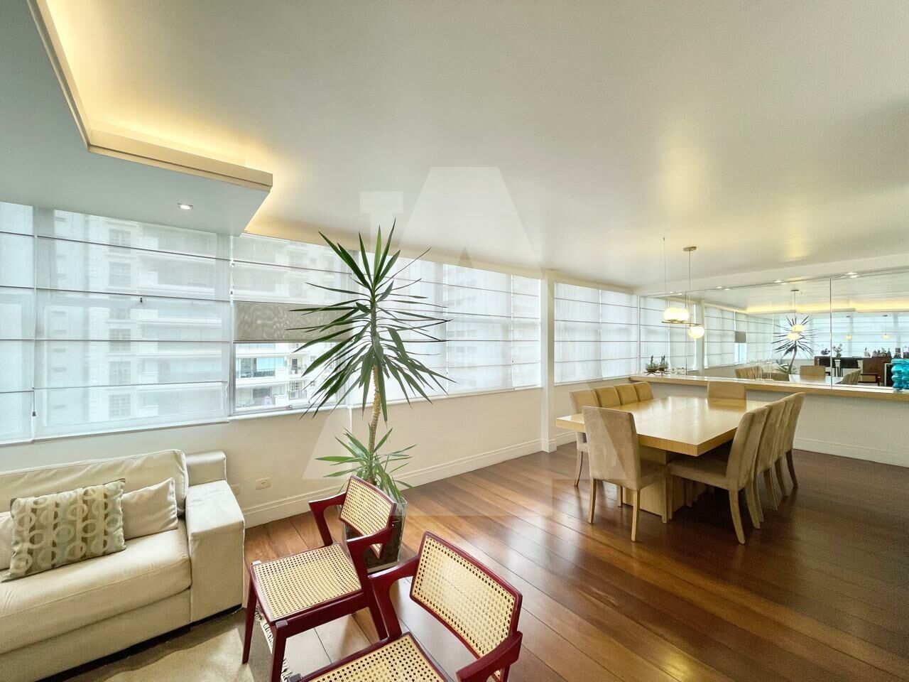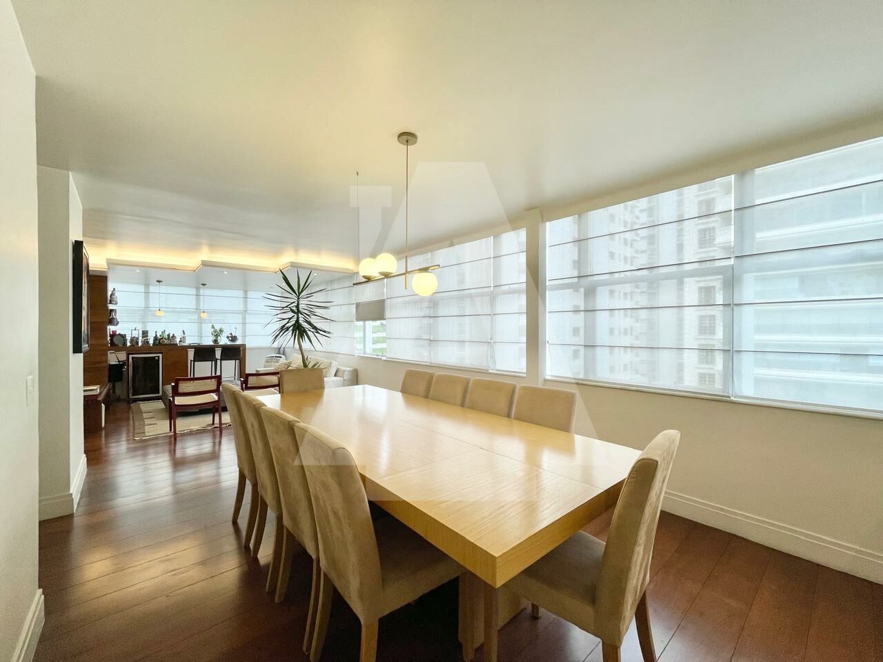 O living para três amplos ambientes é envolvido por grandes janelas que trazem luz natural ao longo de todo o dia. O piso em tábua corrida, impecável e atemporal, valoriza ainda mais a elegância do espaço.