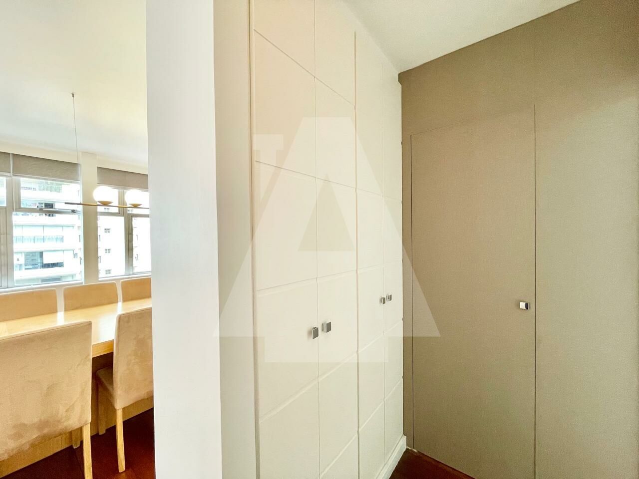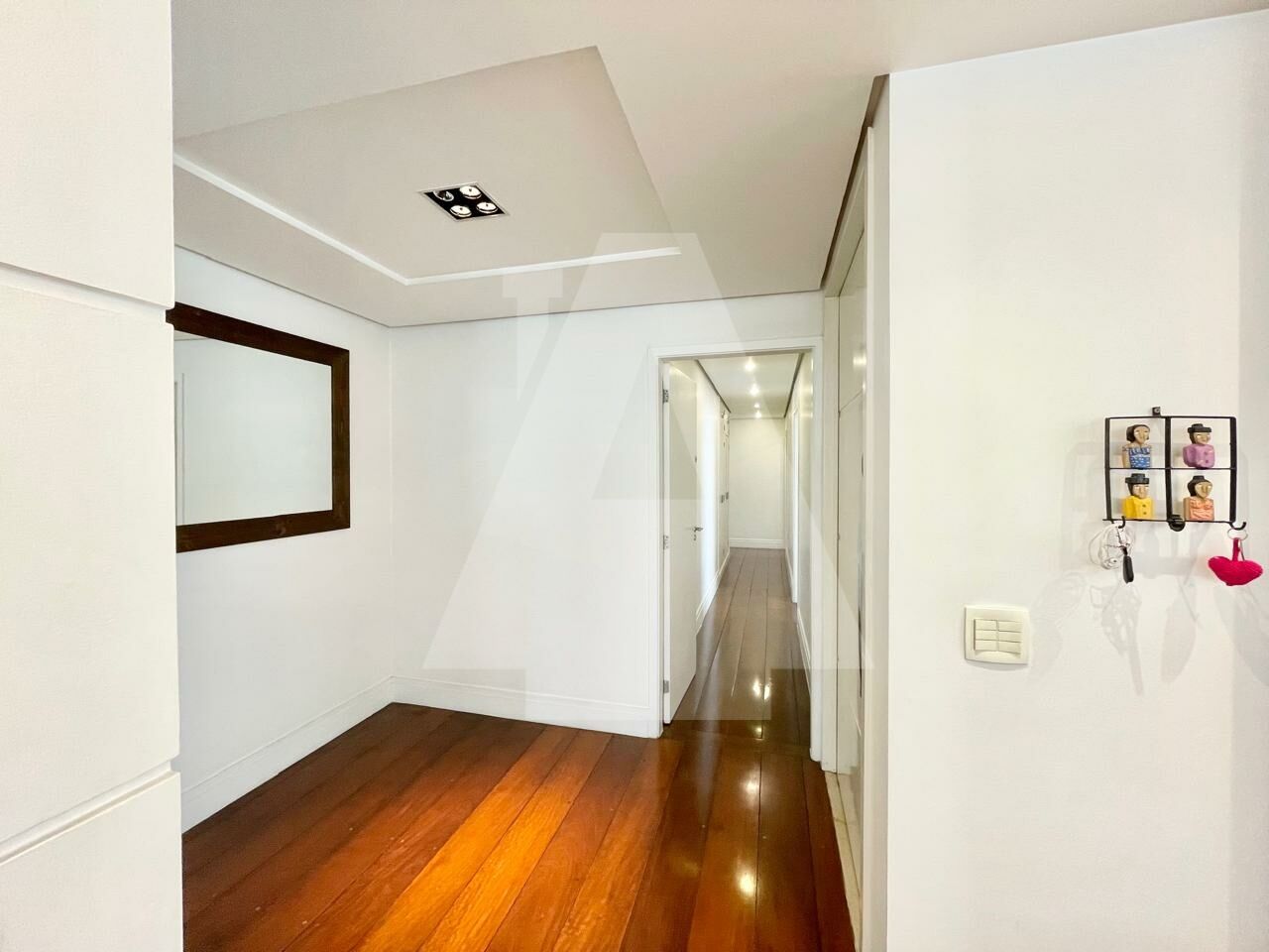 O hall de entrada é um charme, criando uma chegada acolhedora ao apartamento. A área social conta ainda com lavabo, trazendo praticidade para receber.