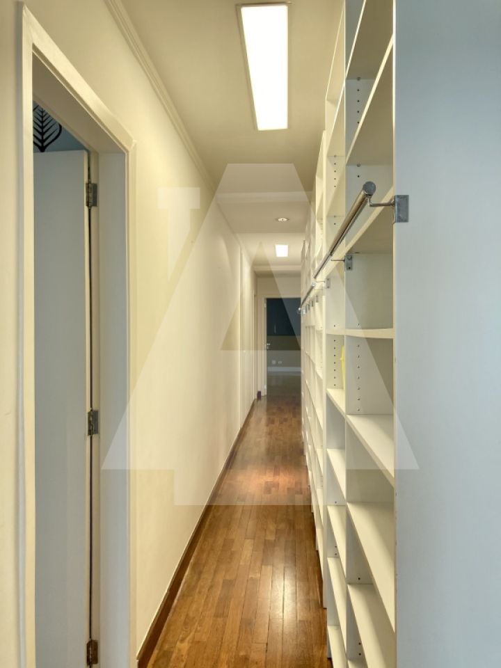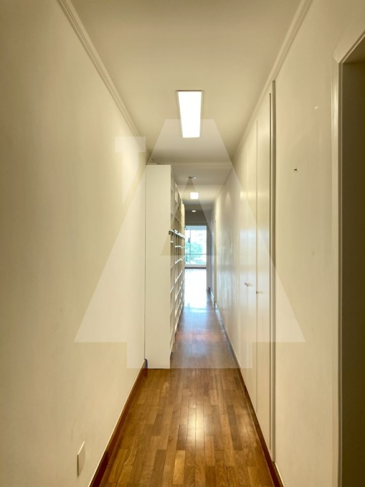 Logo na entrada o hall já anuncia o que vem pela frente: um amplo living em L com janelão piso teto, possibilidade de três ambientes e muita luz natural! Voltando ao hall, encontramos um lavabo e um excelente armário adjacente à porta de entrada. Na ala íntima, um extenso corredor com estante modular nos leva aos 04 dormitórios, sendo 03 suítes (dois dormitórios são interligados e compartilham um mesmo banheiro). Na ala de apoio, copa, cozinha e uma ampla e iluminada área de serviço com dependência dupla. Para finalizar, 02 vagas de garagem.