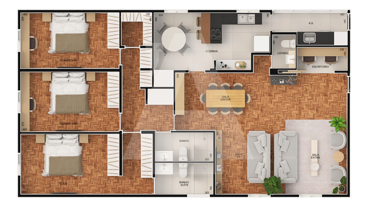 Na área íntima temos 3 amplos dormitórios, sendo que um deles é uma ampla suíte com closet.