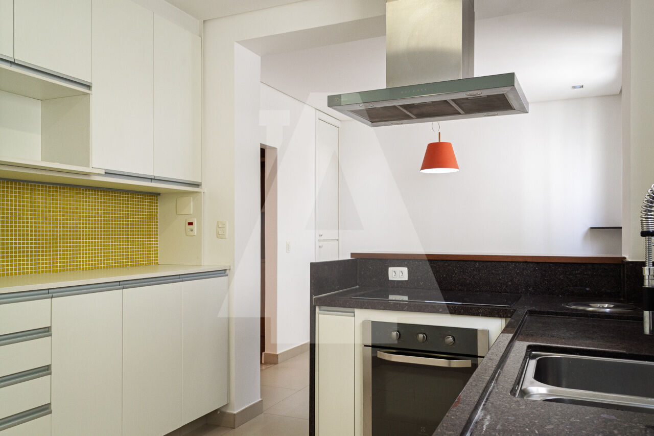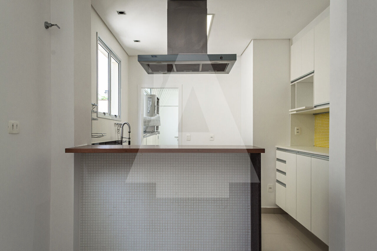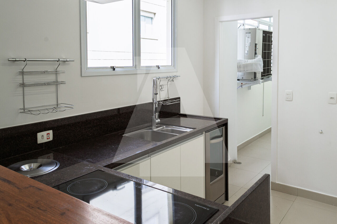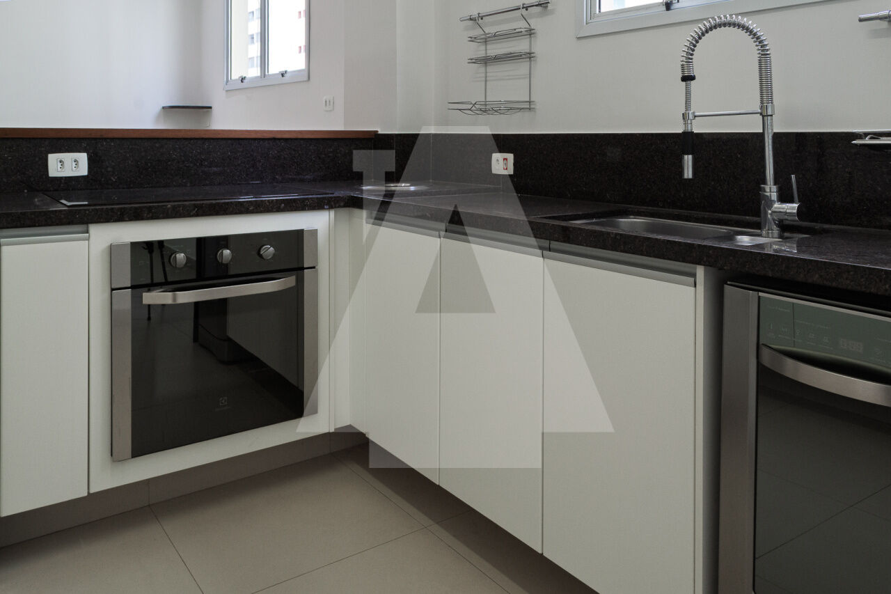 A cozinha é totalmente equipada, com cooktop, coifa, forno e aquecedor a gás, sendo ainda repleta de armários.