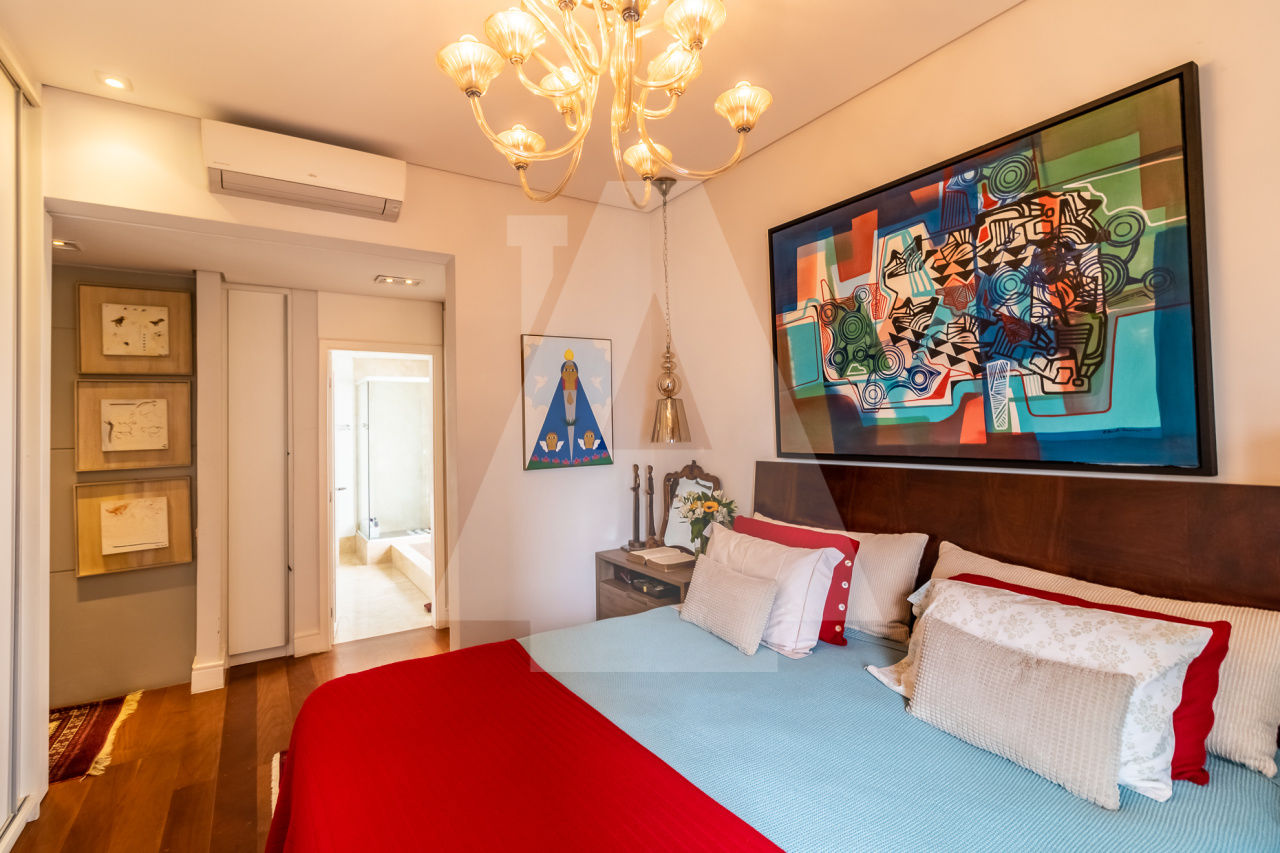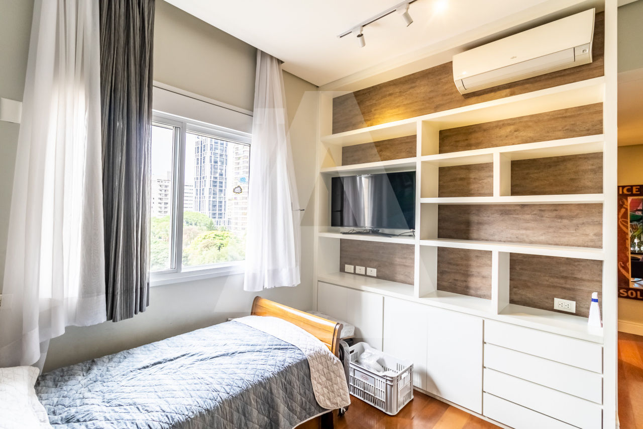 Apartamento repleto de armários, com o piso todo em madeira cumaru e ar condicionado.