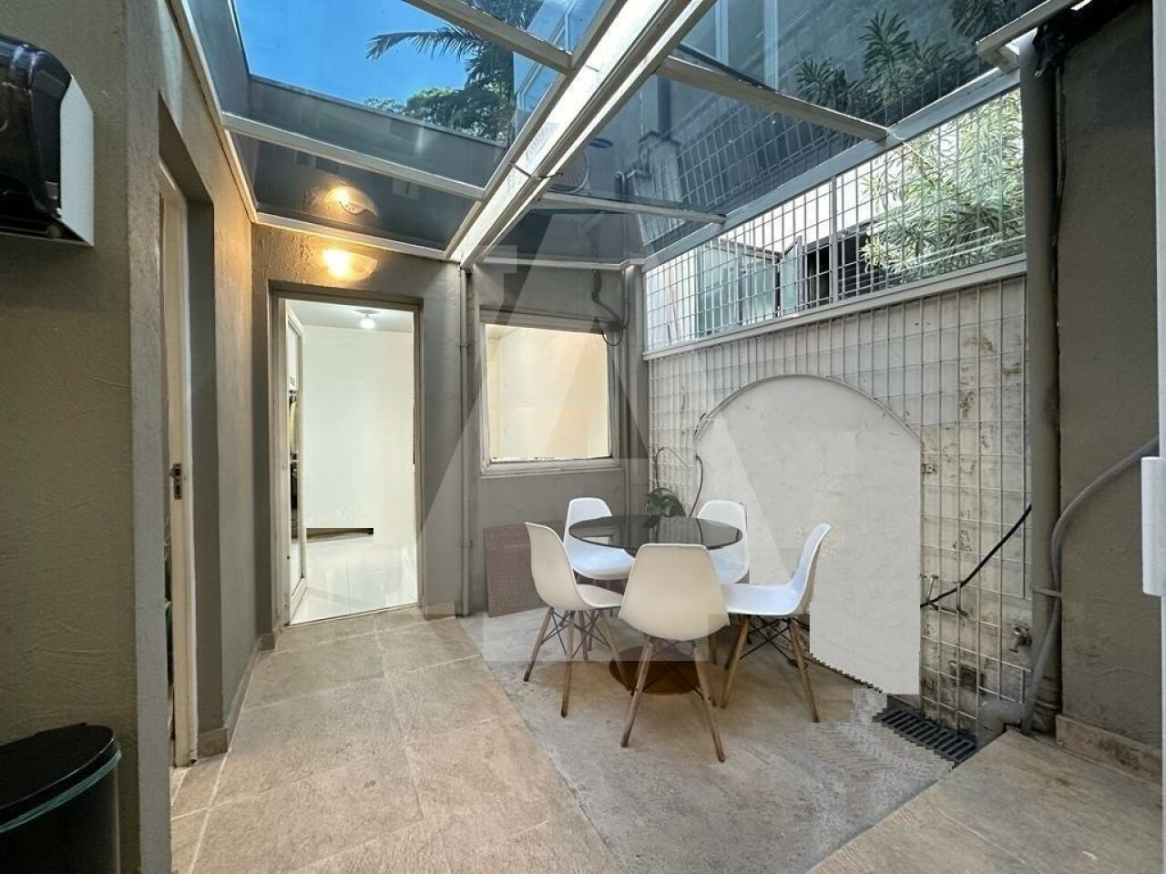 Na parte externa: Quintal coberto com telhado de vidro, com uma pequena copa, um lavabo e uma edícula, que possui as instalações para um terceiro banheiro de serviço, com chuveiro, que pode ser revertido.