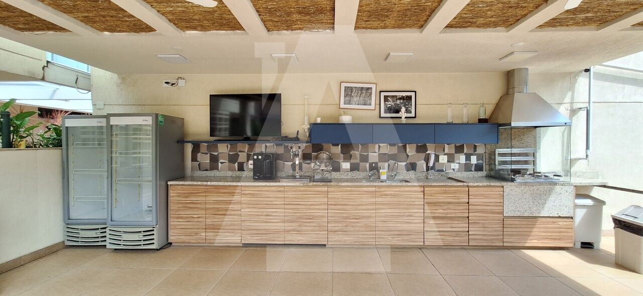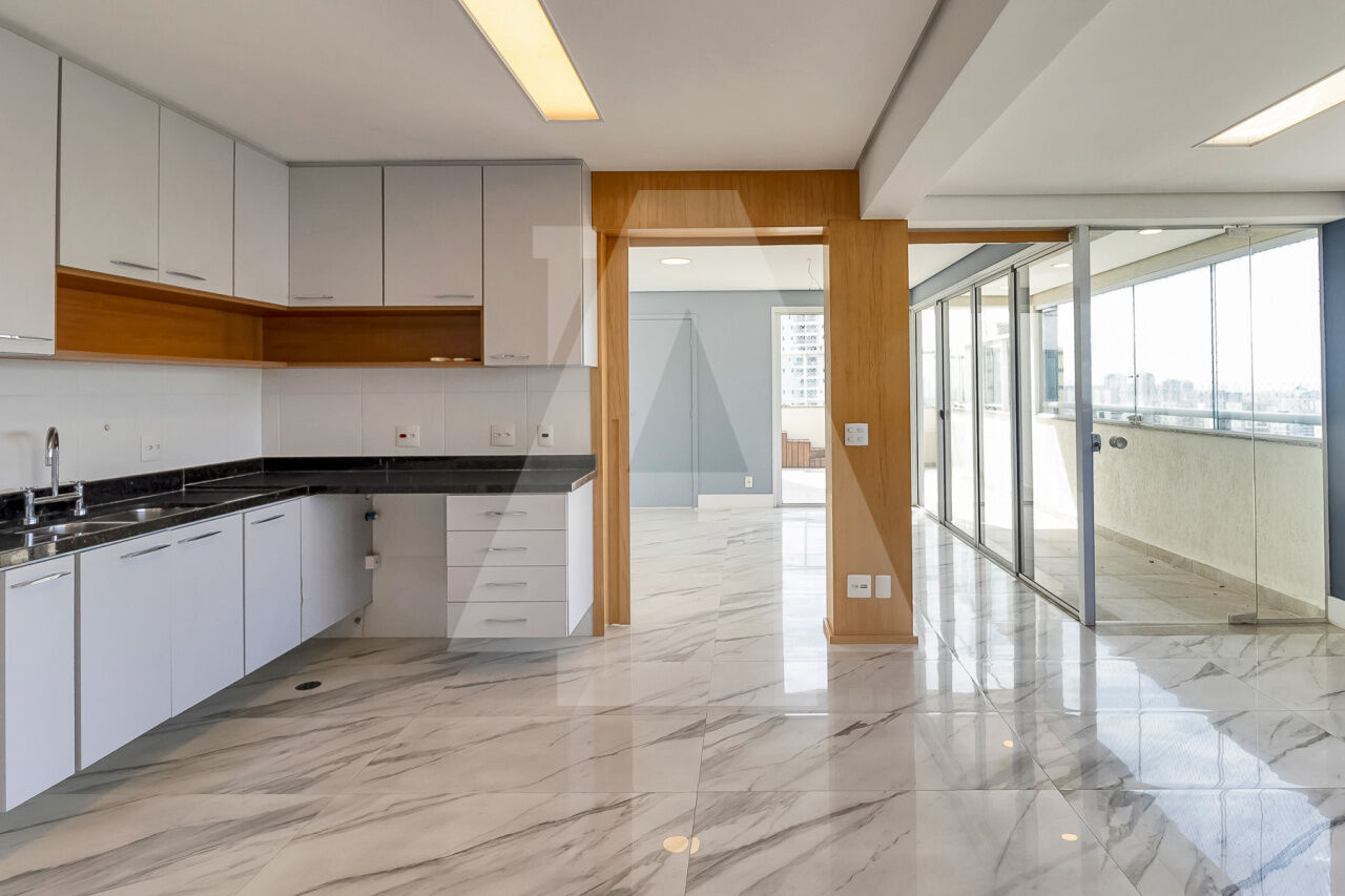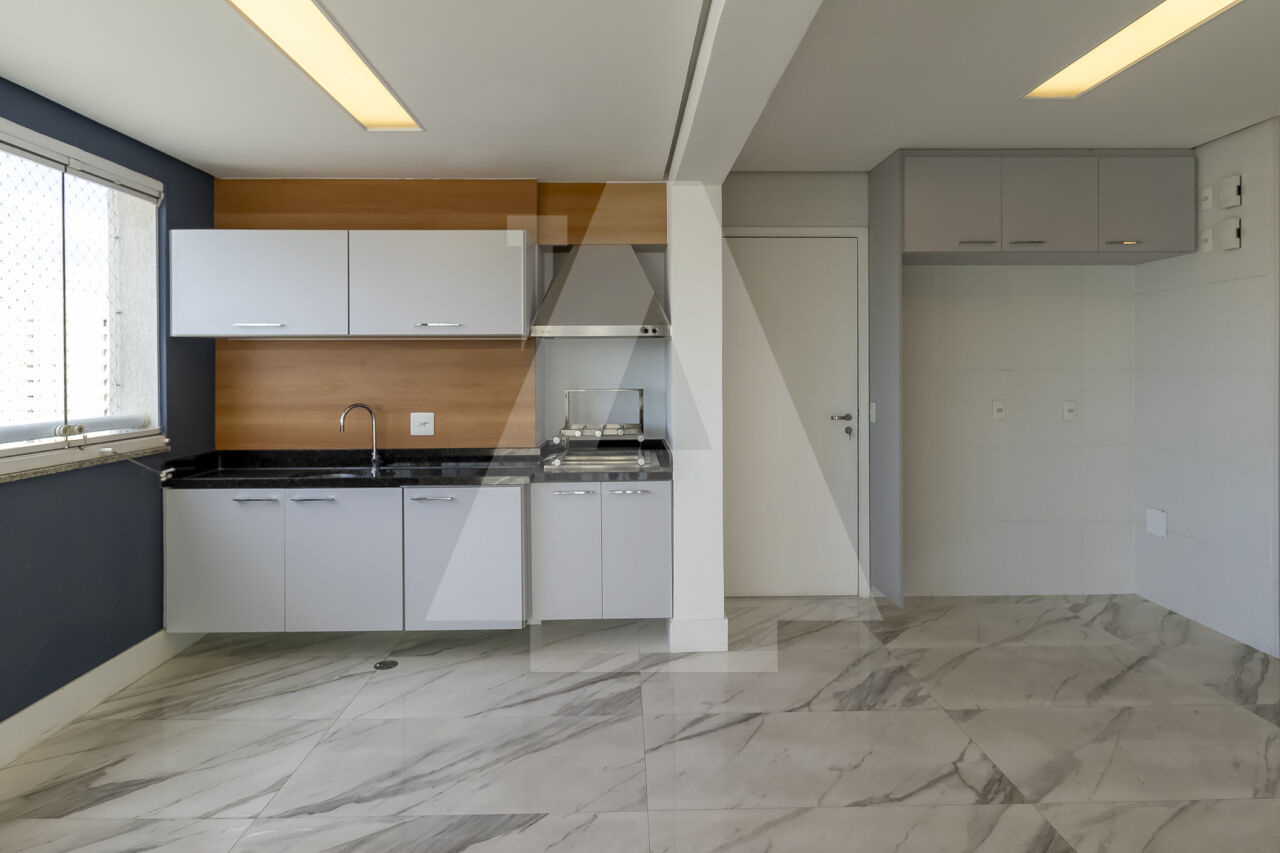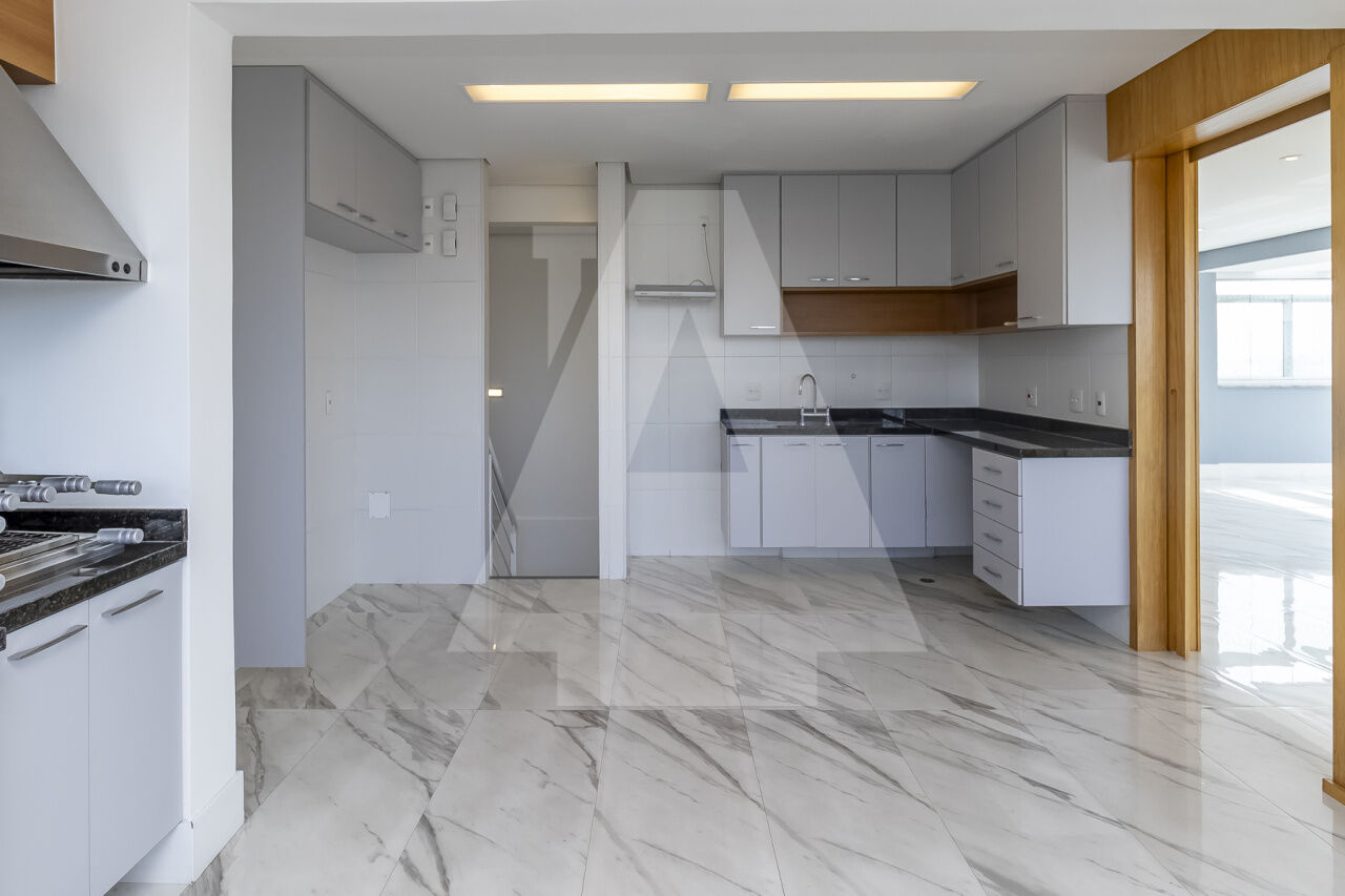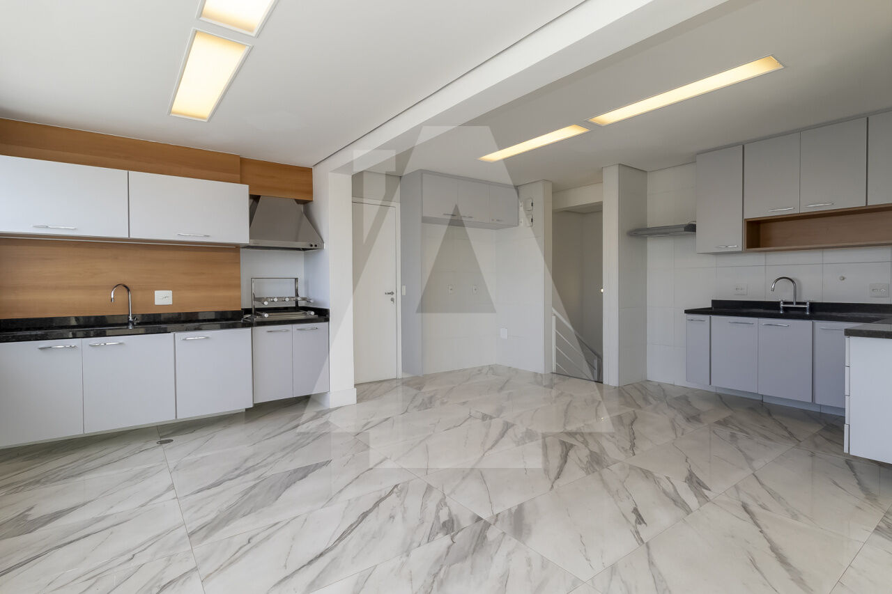 No 19º andar, temos uma amplíssima cozinha com despensa. A churrasqueira com exaustor e a copa estão integradas à cozinha. Há também um lavabo. Todos os ambientes ficaram incríveis com essa vista panorâmica de 360 graus.